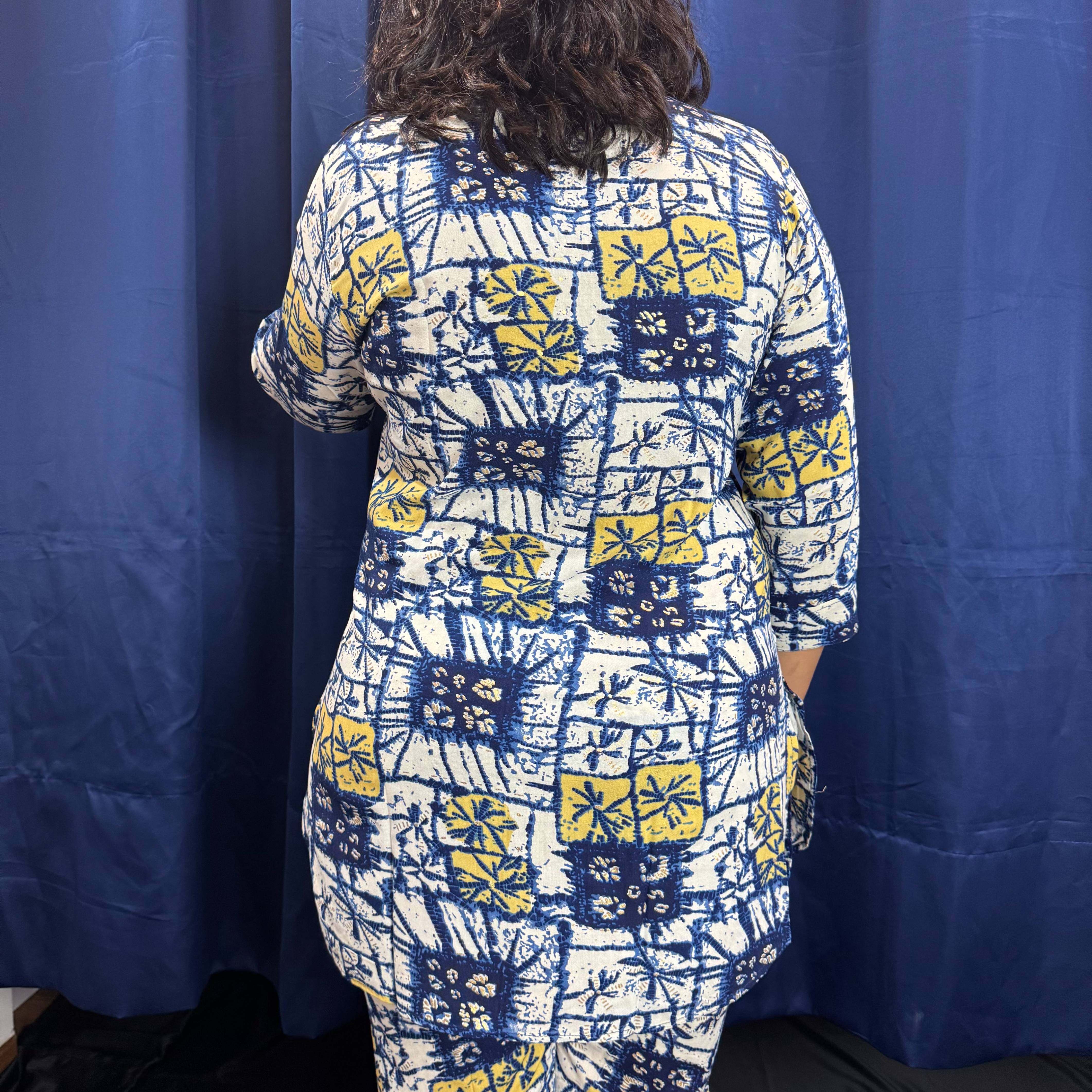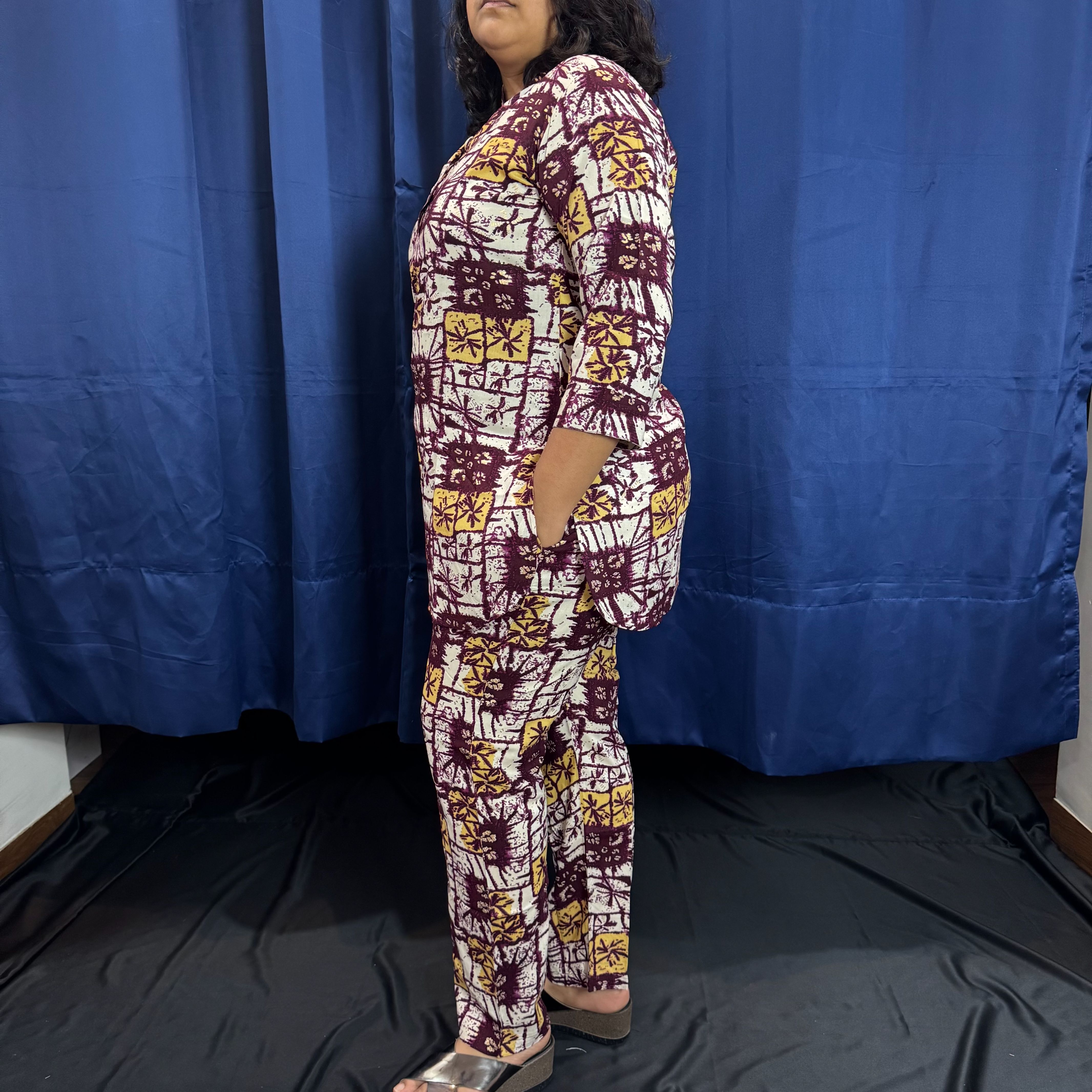 Abstract printed designs all over on a long, relaxed top with matching pants