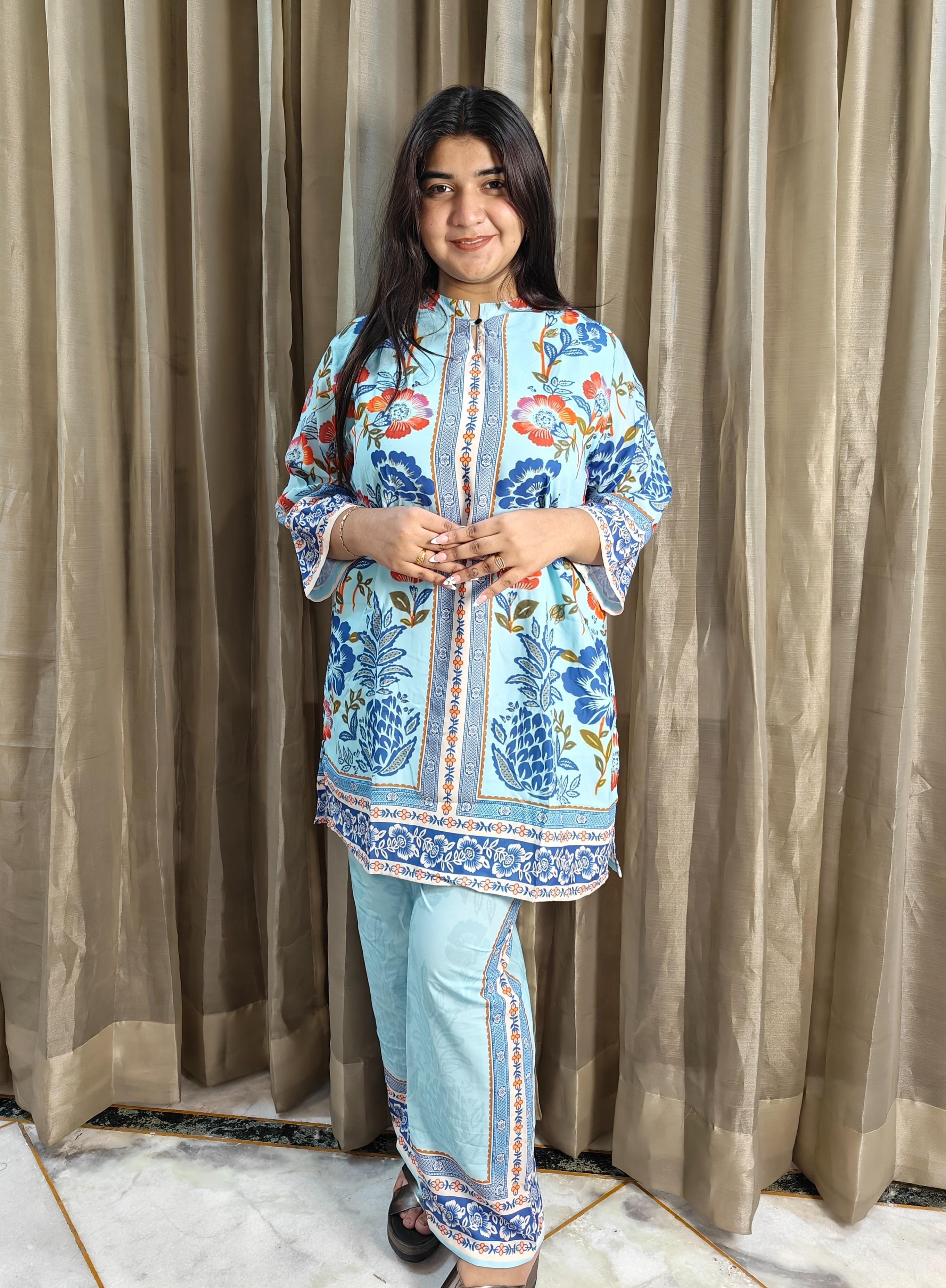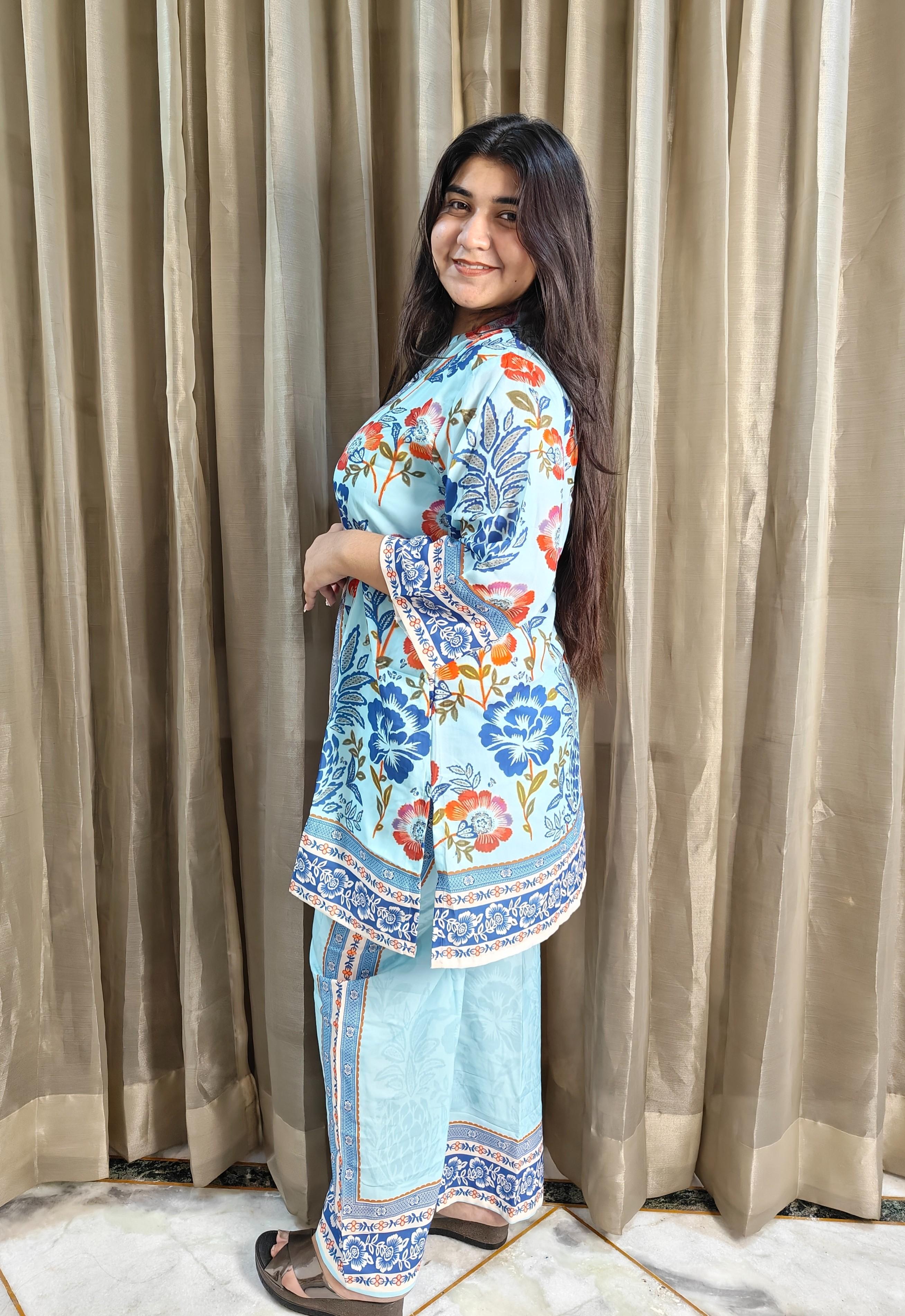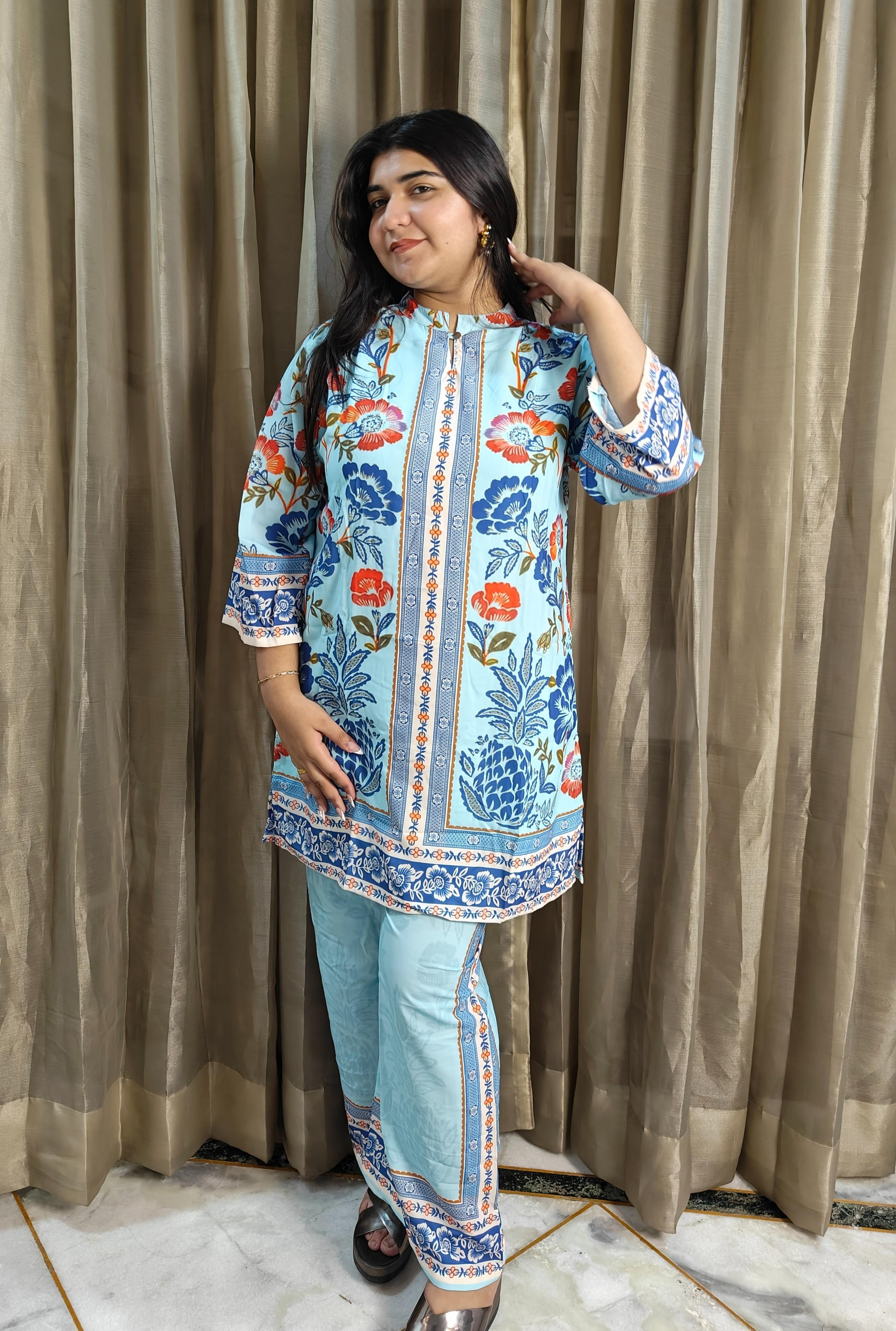 Knee length kurti with matching plazzo pants styled with traditional patterns.