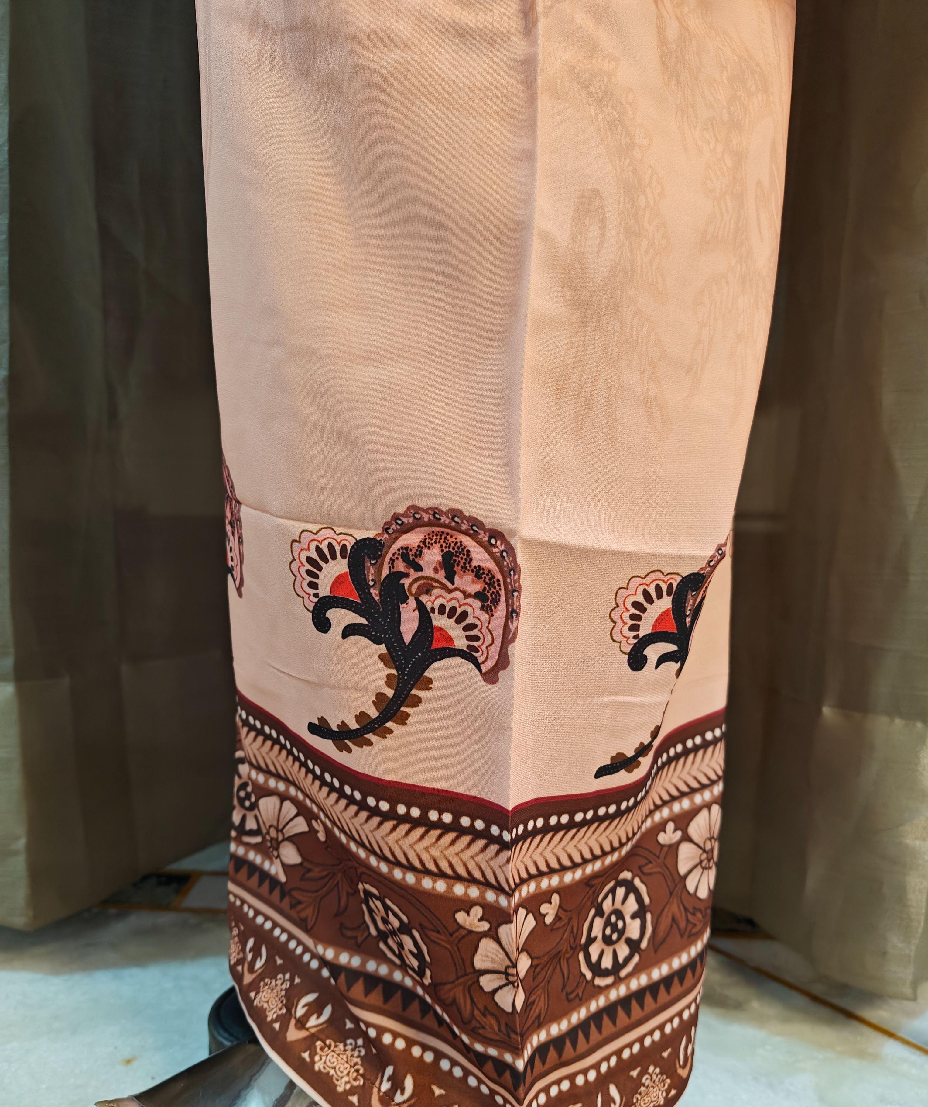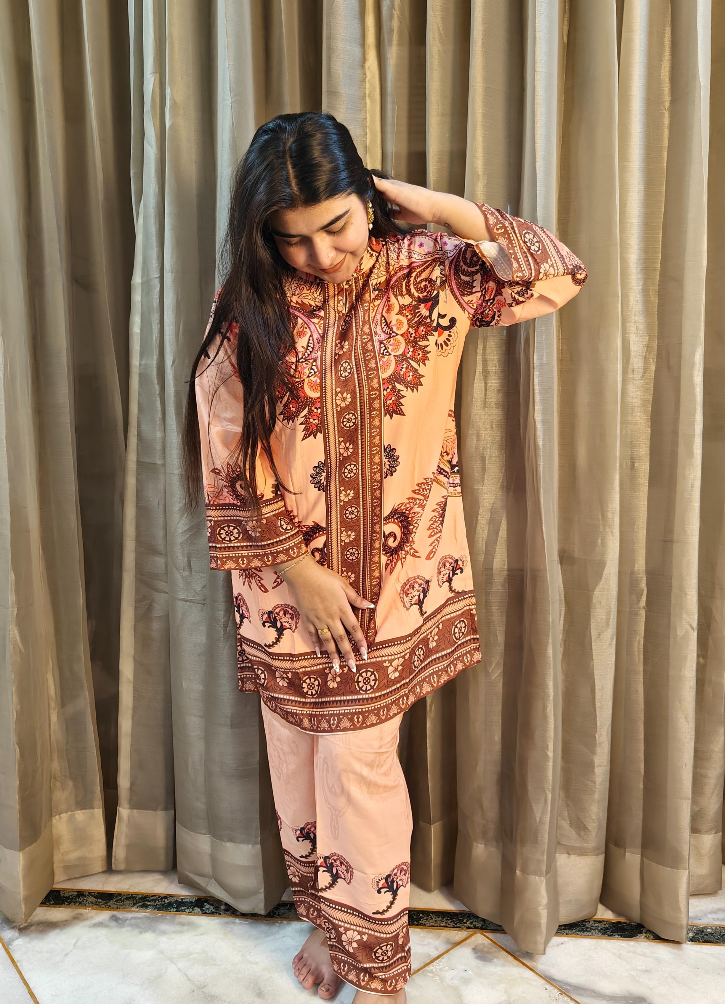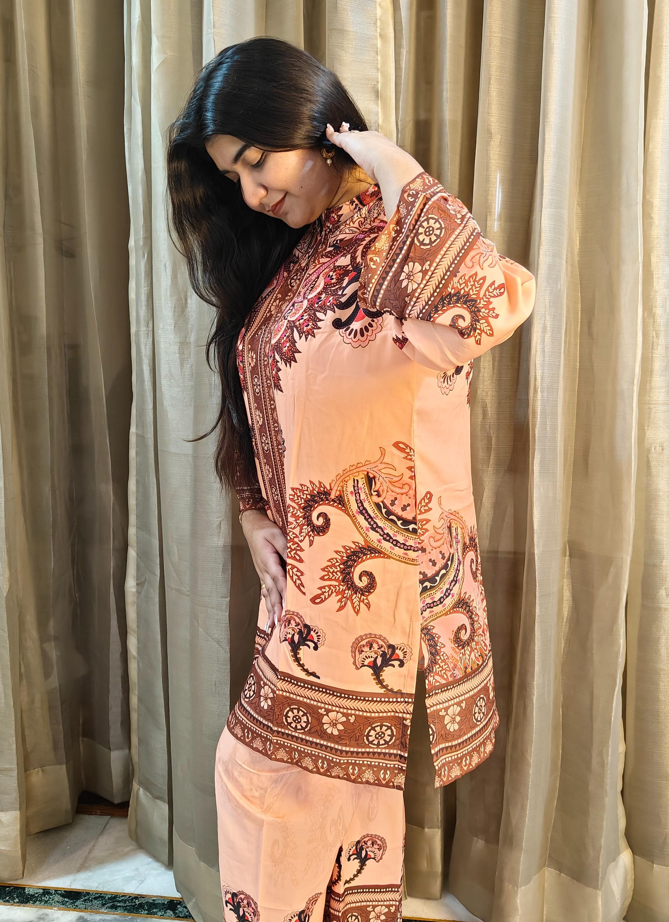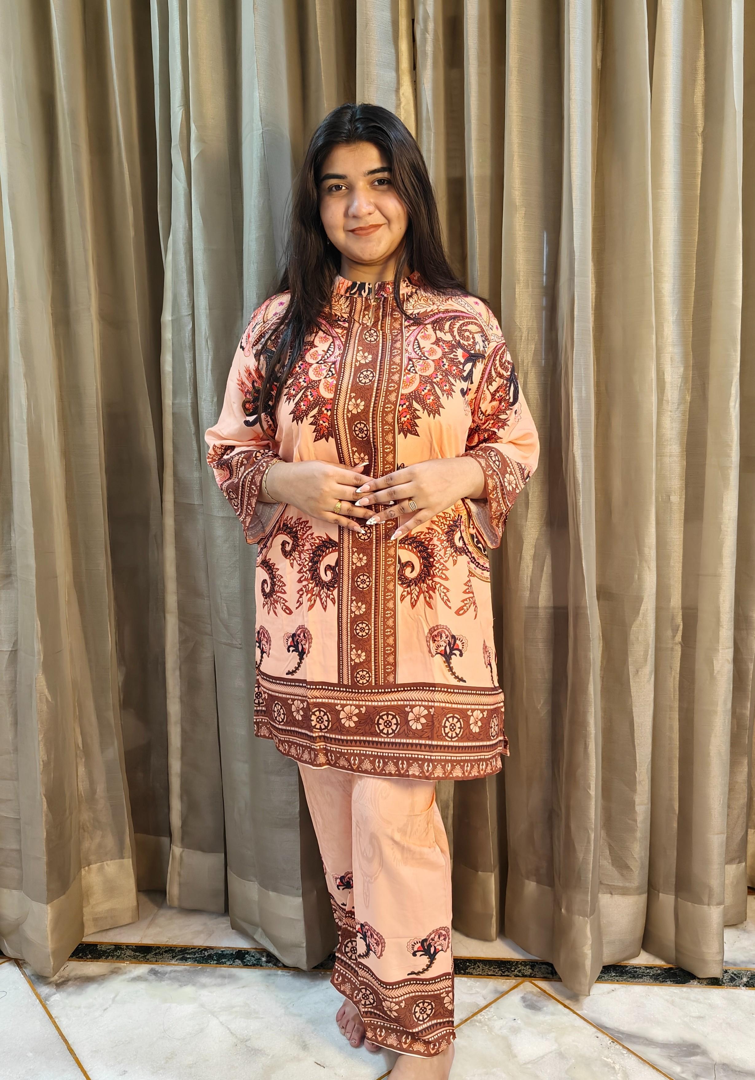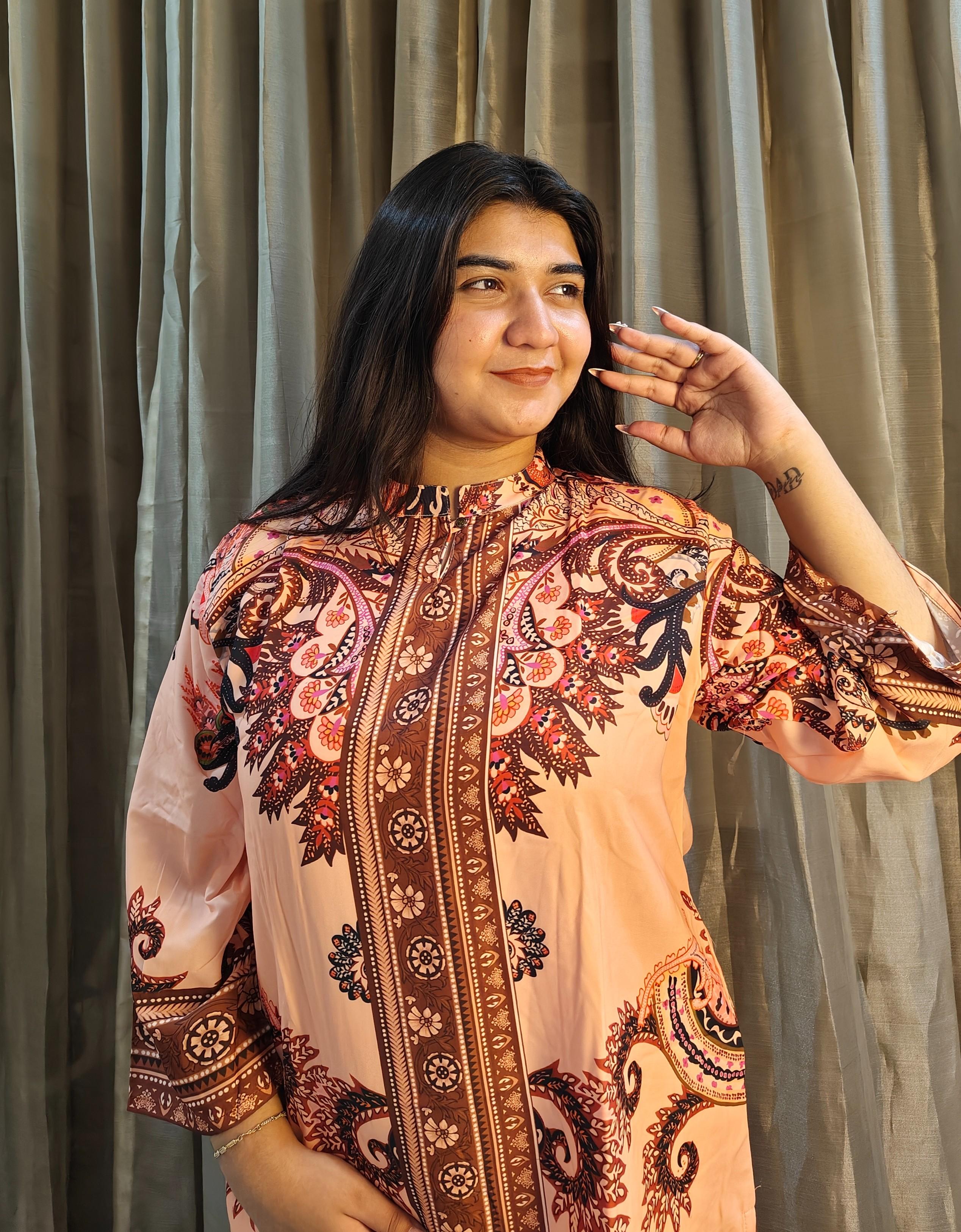 Knee length kurti with matching plazzo pants styled with traditional patterns.