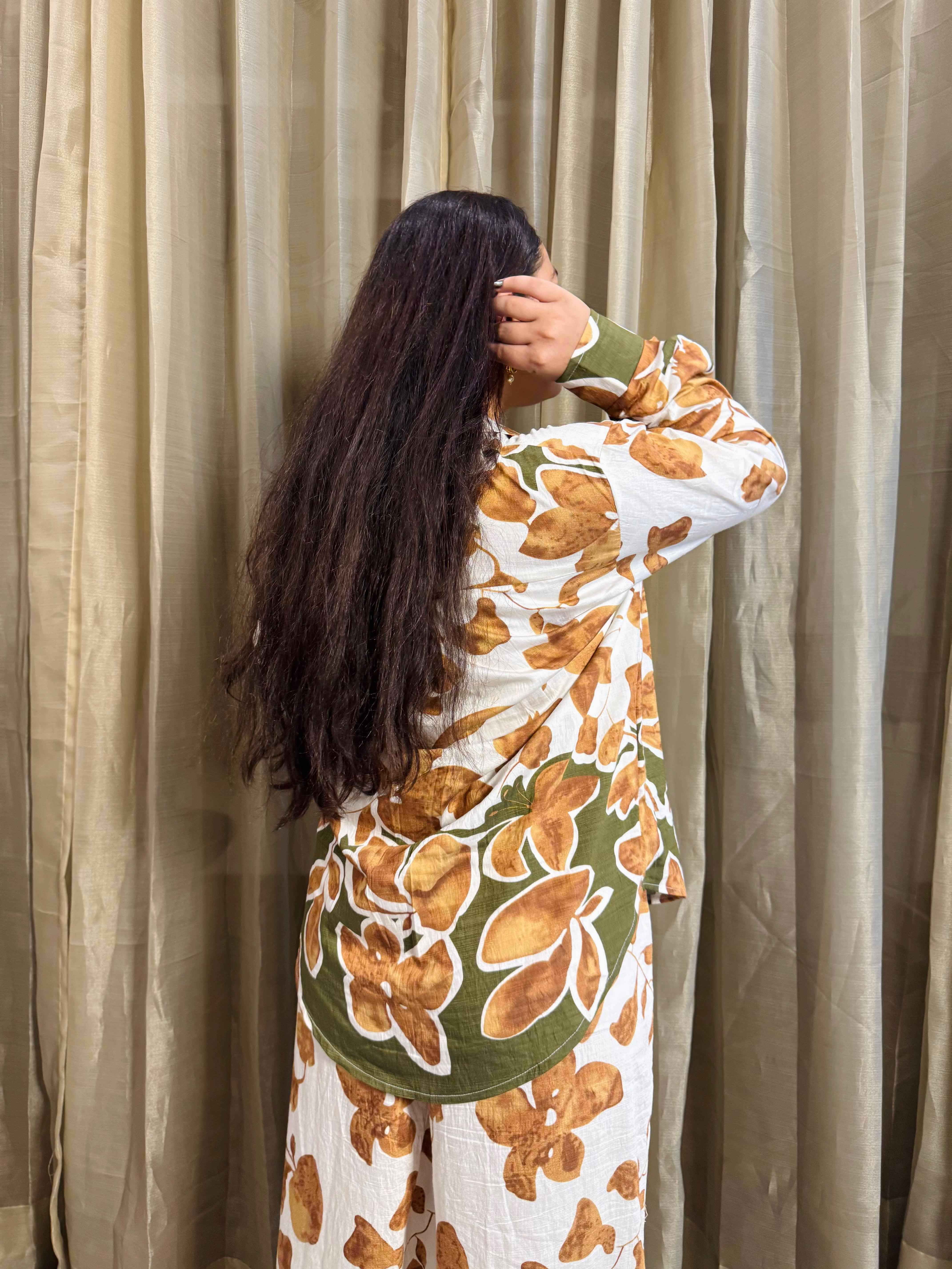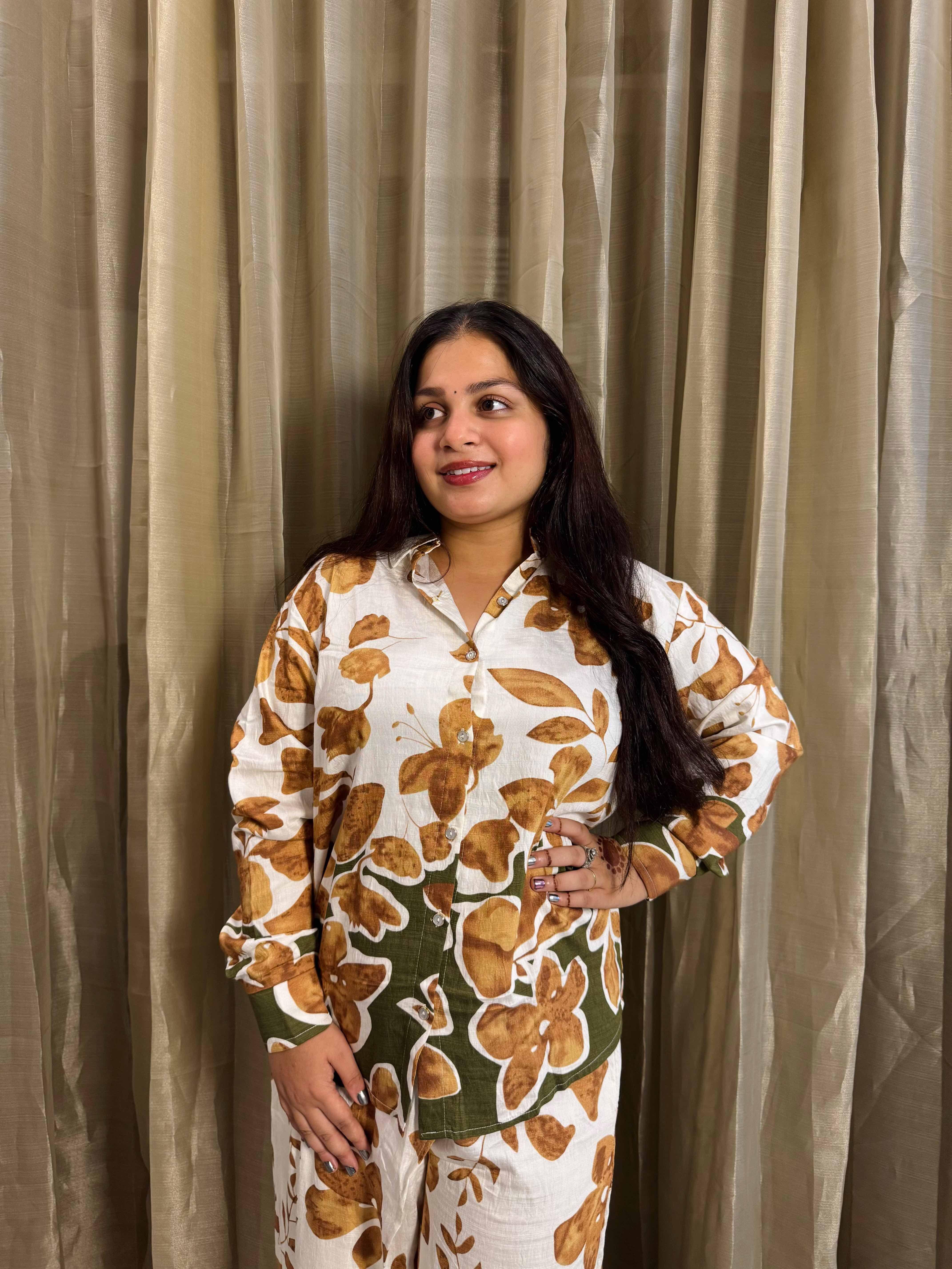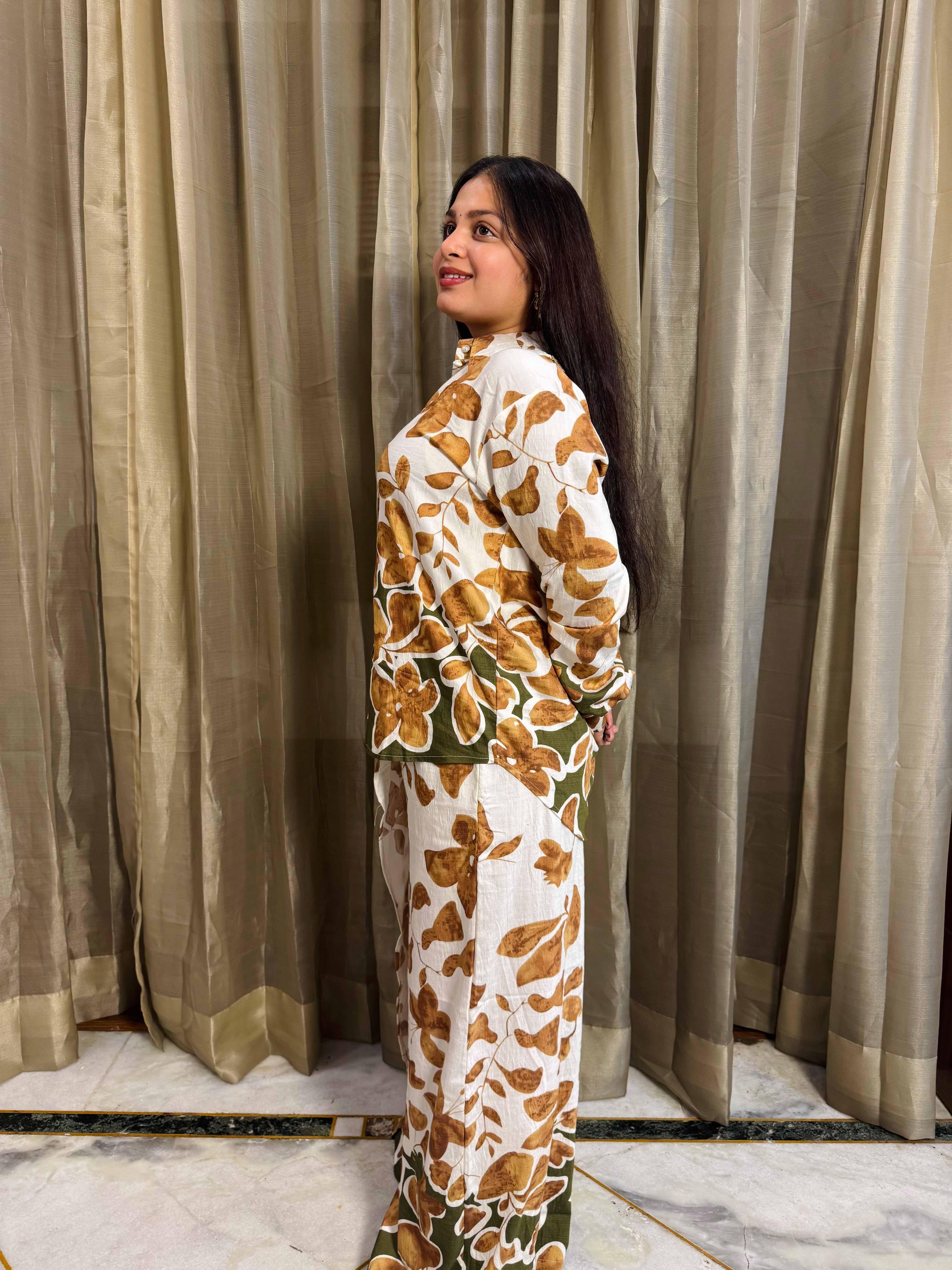 Flowy Floral Shirt with Overlapping wrap detail pant.