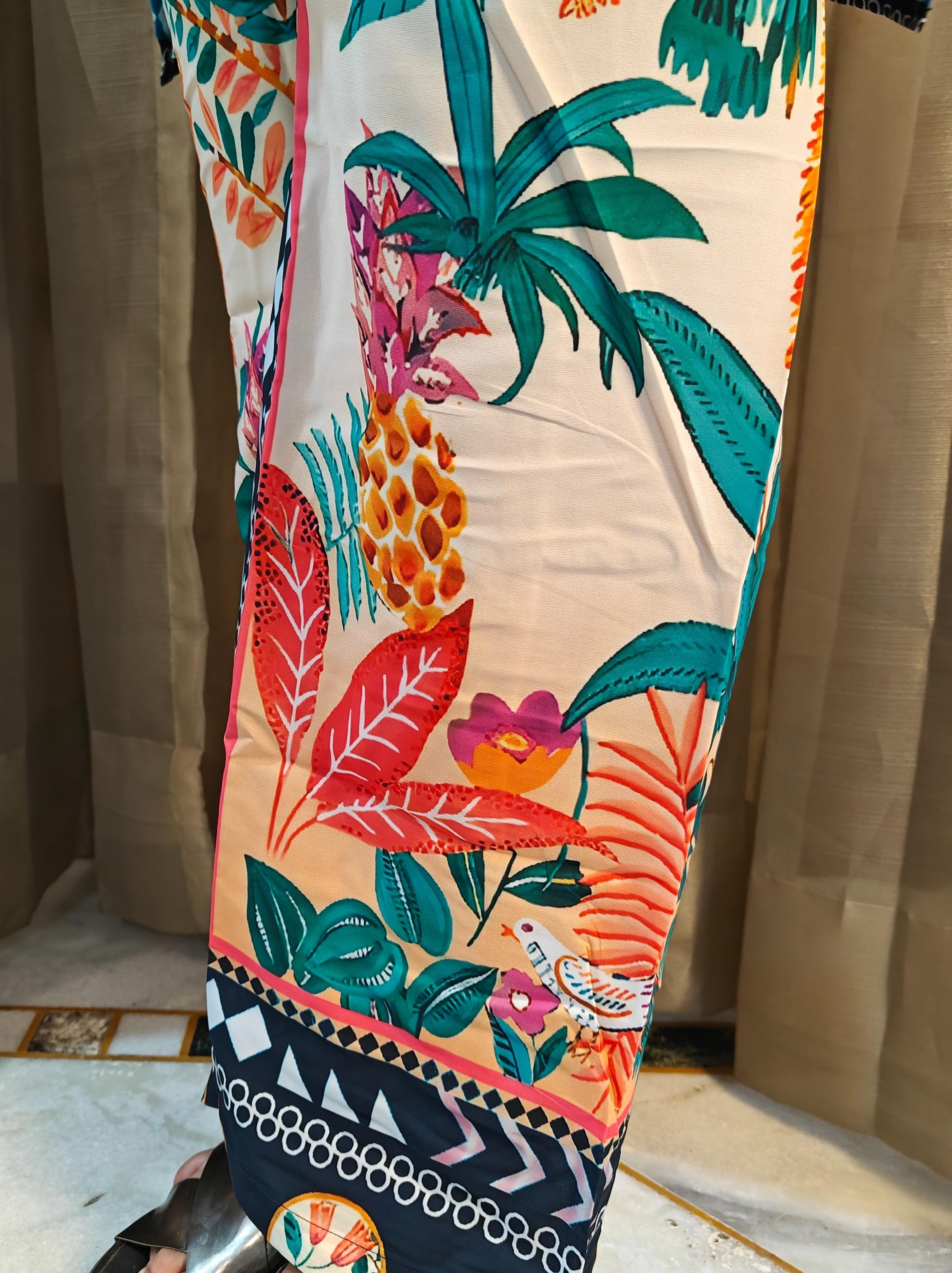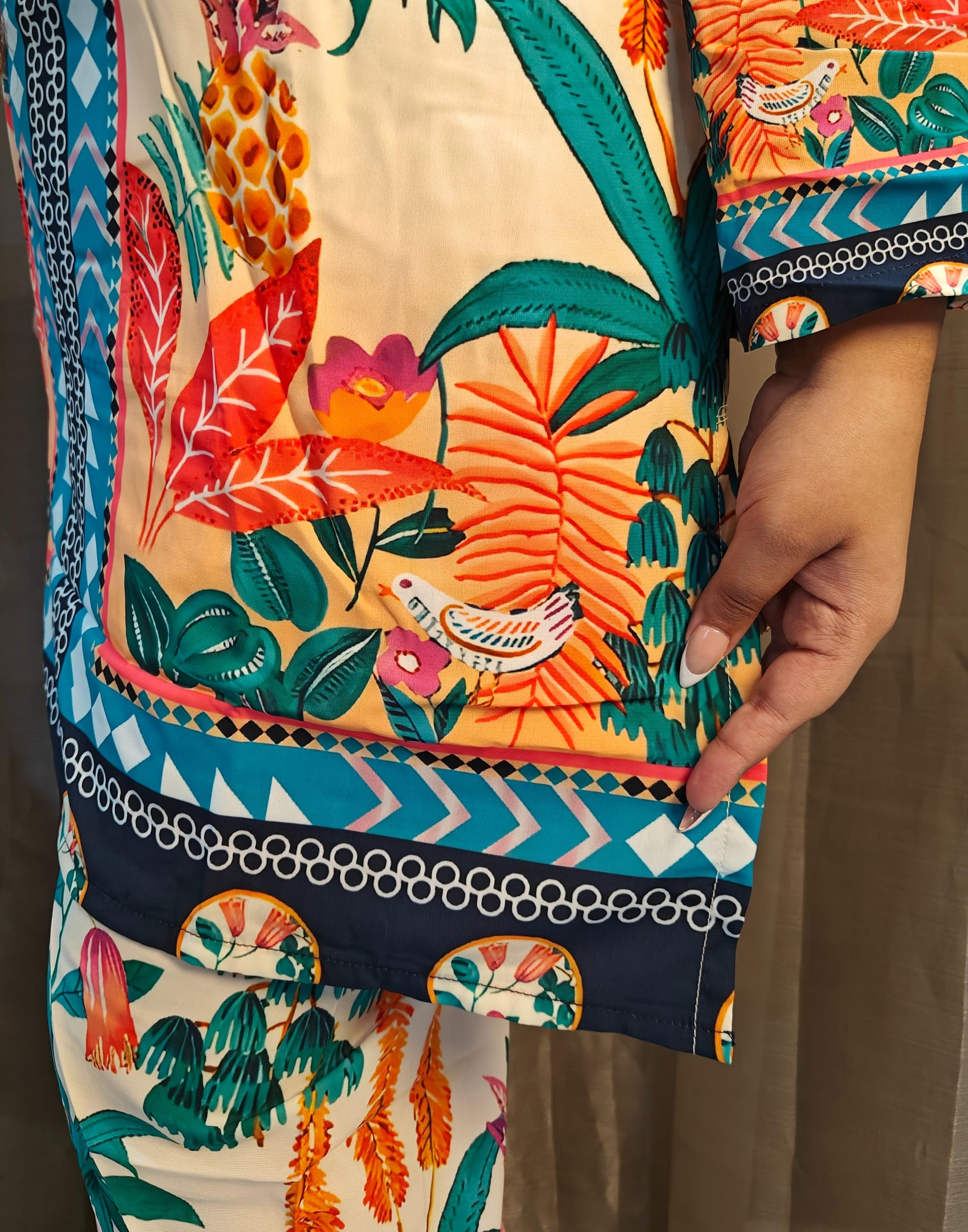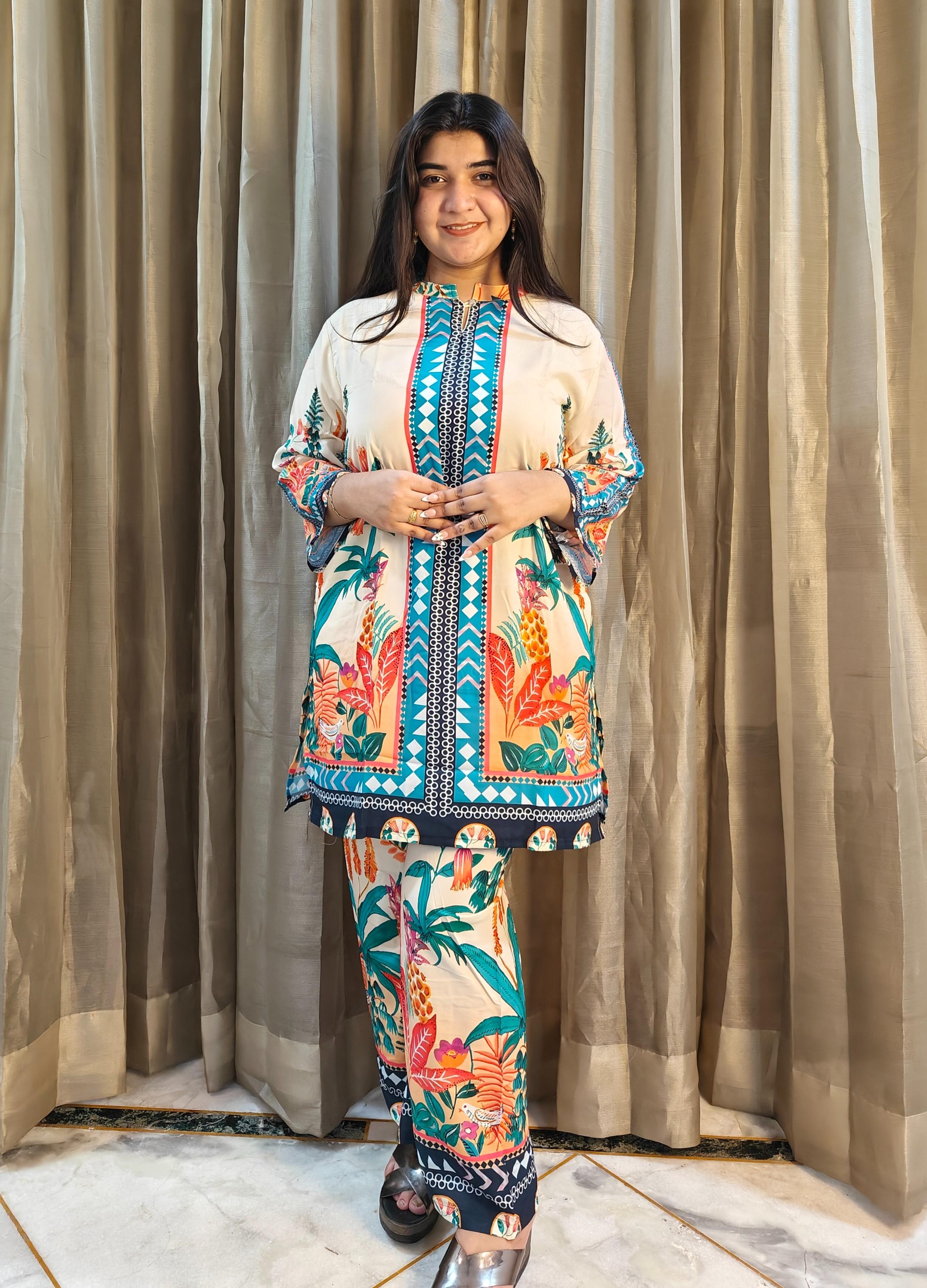 Knee length kurti with matching plazzo pants styled with traditional patterns.