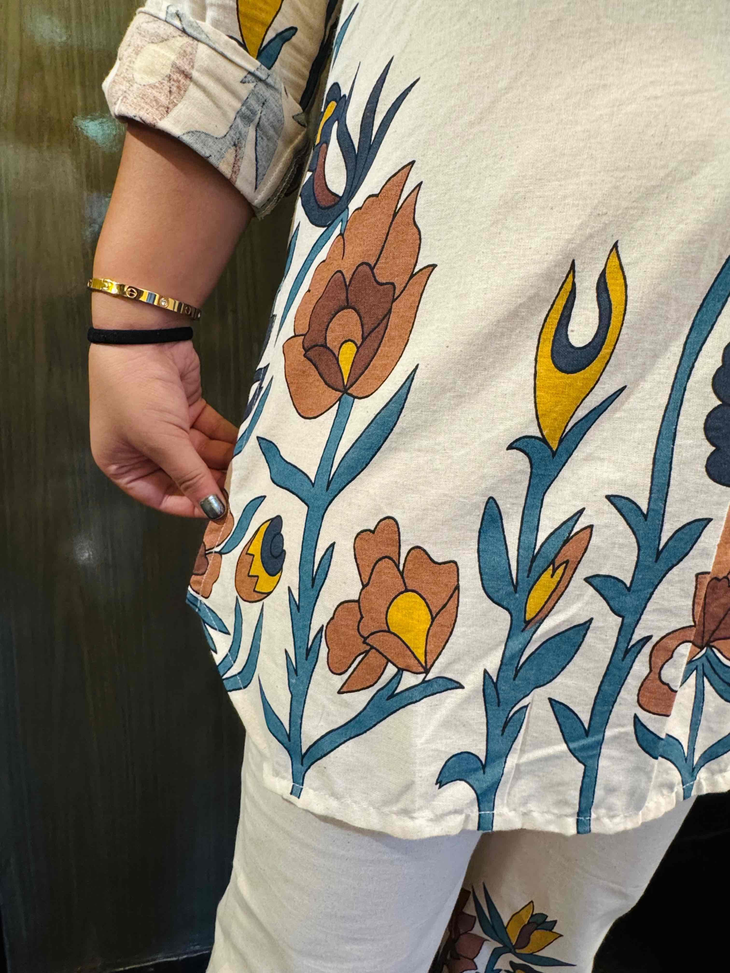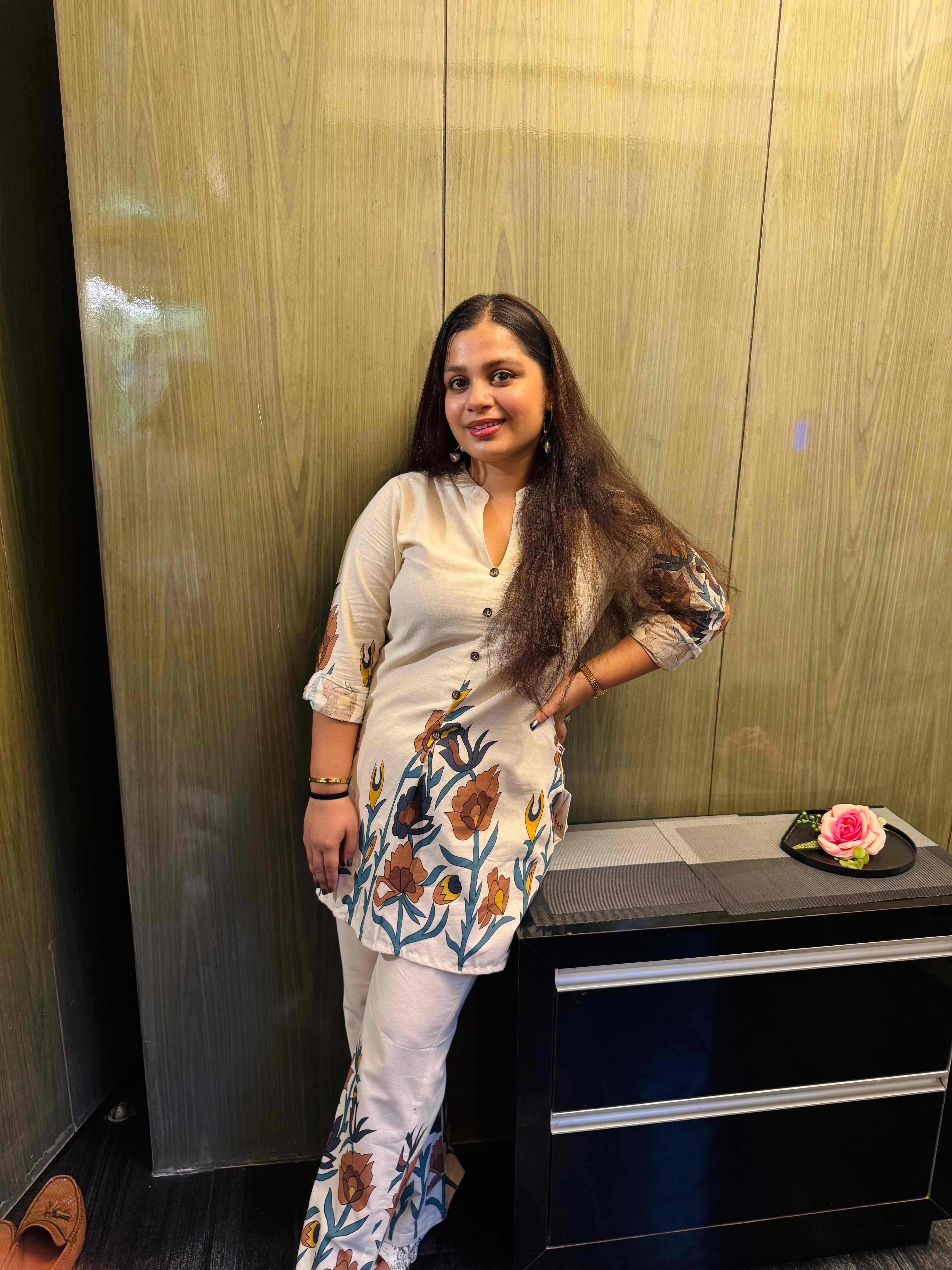 work: Handpainted style , bold artwork, nuetral tone on both the kurti and pant for an aesthetic look